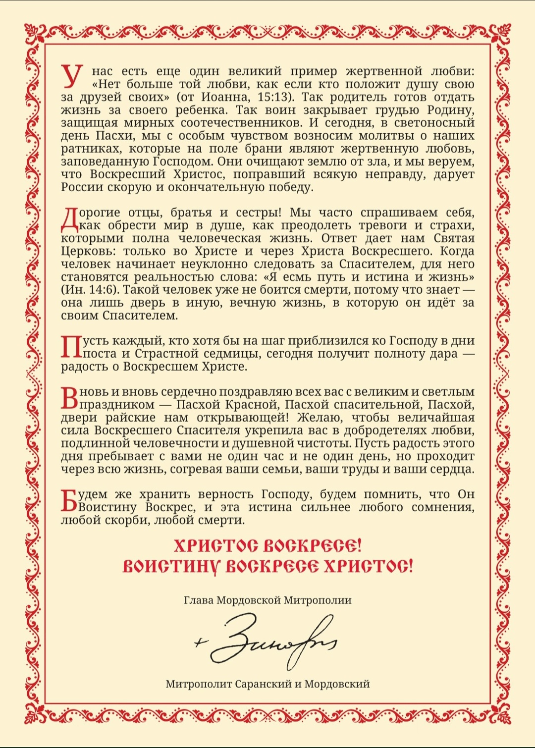 ПАСХАЛЬНОЕ ПОСЛАНИЕ МИТРОПОЛИТА САРАНСКОГО И МОРДОВСКОГО ЗИНОВИЯ 12.04.2026 в Из жизни прихода, Избранное, Новости епархии, Новости Храма, Свежие записи Поделиться:Нажмите, чтобы распечатать (Opens in new window)Отправить ссылку в Одноклассники (Opens in new window)Отправить ссылку в ВКонтакте (Opens in new window)Отправить ссылку в Мой Мир (Opens in new window)БольшеClick to share on Google+ (Opens in new window)Поделитесь в Twitter (Opens in new window)